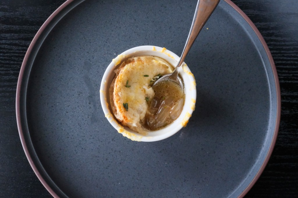 Caramelized onions, thyme, and homemade beef stock. Liberal splash of dry sherry. Emmental and Gruyère.